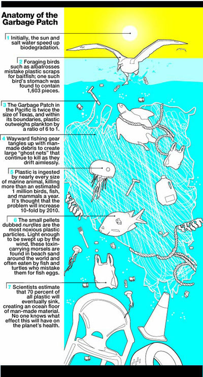 The North Pacific Subtropical Gyre is made up of two large masses of ever-accumulating rubbish, known as the Western and Eastern Pacific Garbage Patches. It is in this gyre, a huge swirling mass of plastic soup, estimated by some to be the size of the United States that the plastic bag or plastic water bottle, thought to be in a landfill or recycled, may end up. |